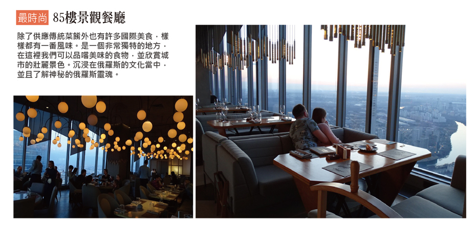 除了供應傳統菜餚外也有許多國際美食,樣樣都有一番風味。是一個非常獨特的地方,在這裡我們可以品嚐美味的食物,並欣賞城市的壯麗景色。沉浸在俄羅斯的文化當中,並且了解神秘的俄羅斯靈魂。