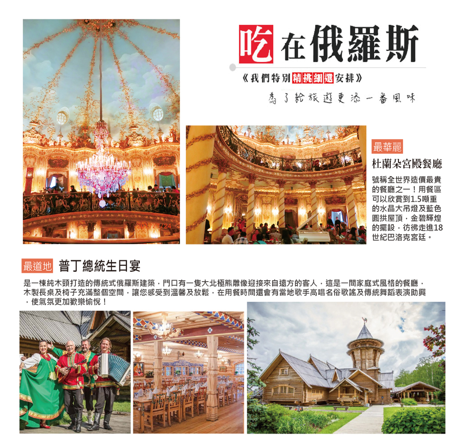 精心安排於俄羅斯的頂級餐廳之杜蘭朵餐廳;花費15億台幣打造、耗時六年半才完工的杜蘭朵餐廳,號稱全世界造價最昂貴的餐廳之一,金碧輝煌的裝潢呈現了極致奢華的宮廷風格。